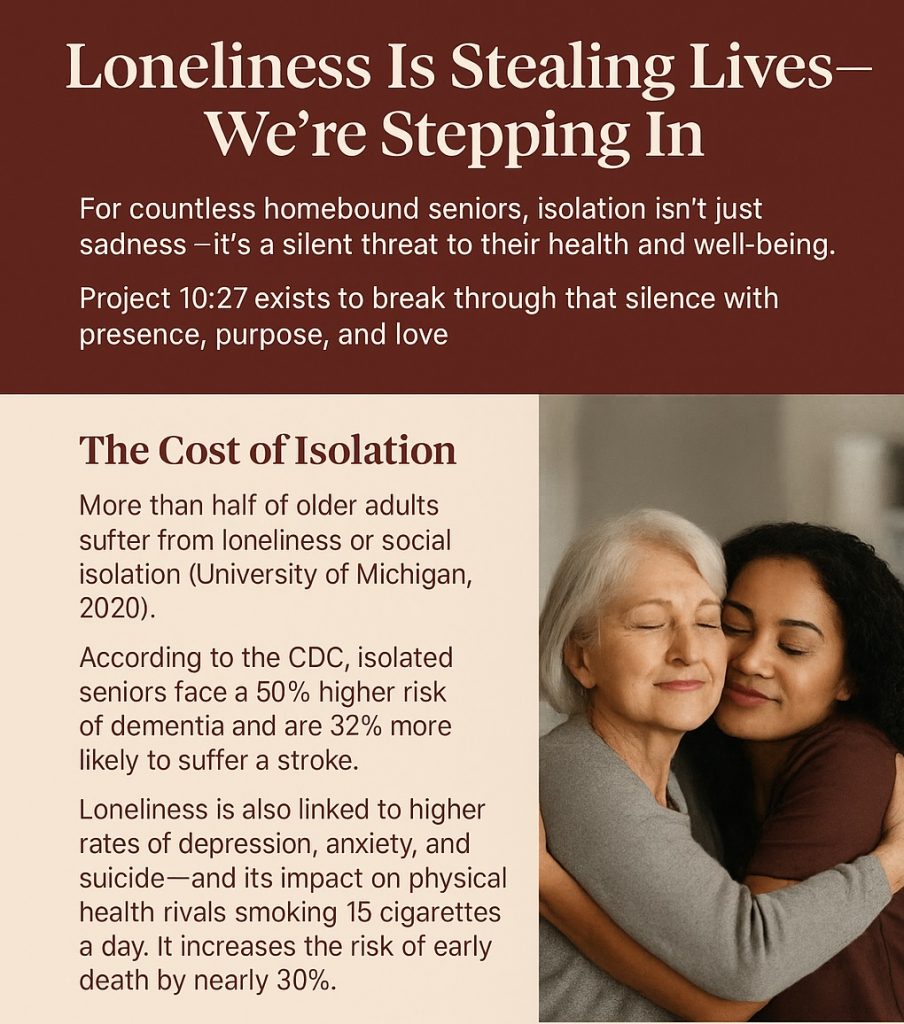 In a world where too many seniors feel forgotten, Project 10:27 brings connection, comfort, and care. Through a holistic, relationship-driven approach, our programs support the emotional, spiritual, and practical needs of homebound seniors. By strengthening social bonds and restoring a sense of belonging, we are actively reducing the harmful effects of isolation—one life at a time.